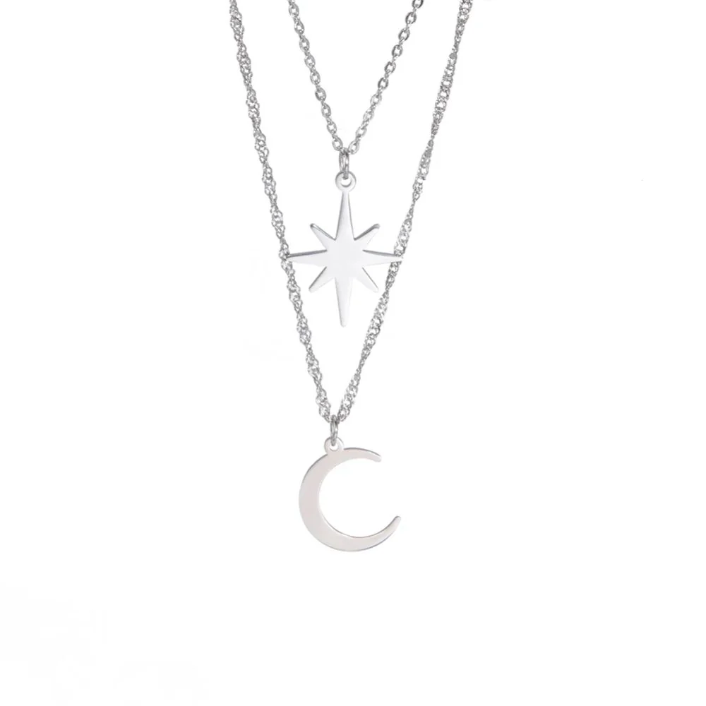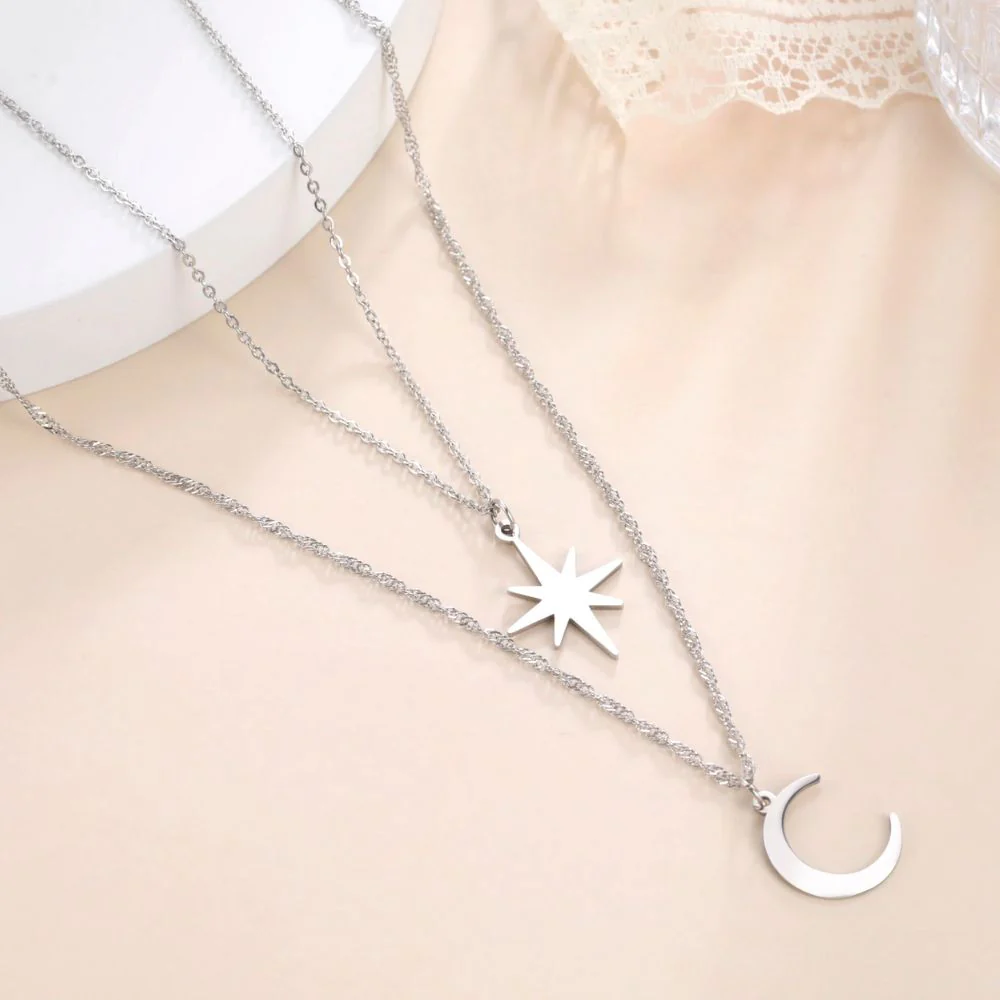 Découvrez l’éclat céleste de notre collier lune étoile en acier inoxydable, un bijou qui capture la magie de la nuit et des étoiles. Disponible en deux finitions, or et argent, ce collier à doubles chaînes est orné d’une étoile sur l’une et d’une lune sur l’autre, ajoutant une touche de mystère et de féminité à votre look.