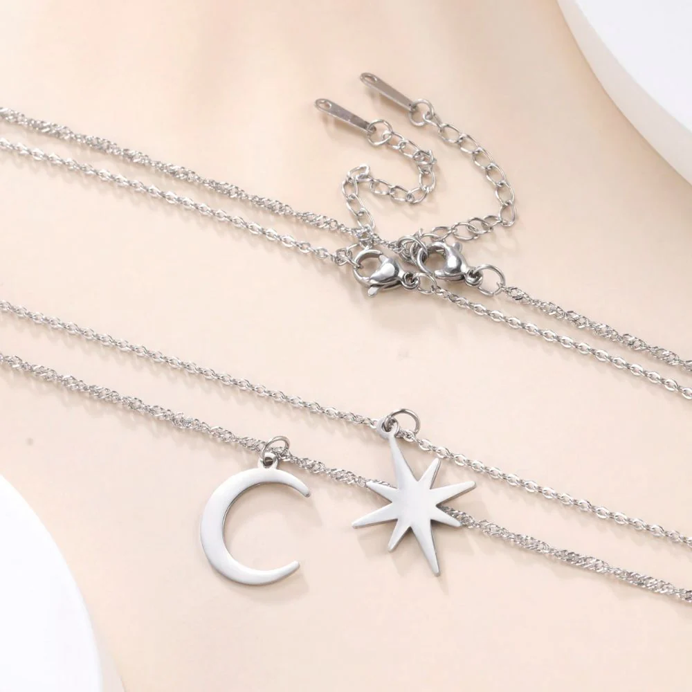 - Design double chaînes : Ce collier se compose de deux chaînes délicates, l’une ornée d’une étoile et l’autre d’une lune, offrant un effet de superposition subtil et élégant.