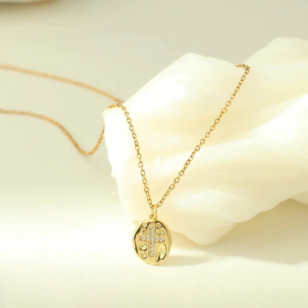 Un collier avec médaille sertie d’une croix, au caractère authentique ! Ce pendentif doré à la forme légèrement irrégulière porte une croix centrale ornée de zircons blancs. Les motifs gravés qui l’entourent ajoutent du relief et un aspect artisanal, pour un bijou empreint de charme et d’authenticité.