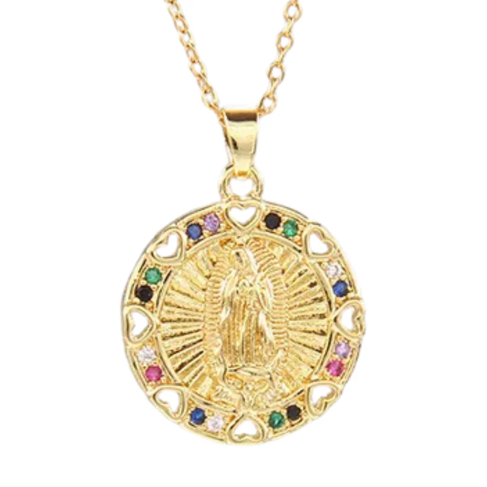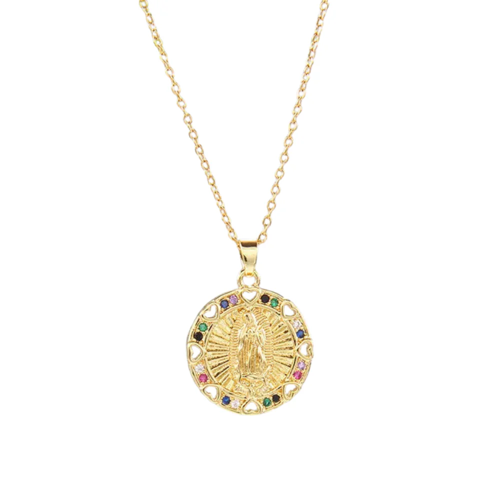 Craquez pour notre majestueux collier rond avec médaillon de la Vierge Marie en plaqué or. Sa conception met en valeur une représentation minutieuse de la Mère de Dieu. Entourée de petits cœurs en métal doré ajourés, la médaille est subtilement parée de pierres multicolores harmonieuses. Ce pendentif chaleureux et plein de tendresse se porte avec facilité pour marquer élégamment son attachement spirituel et émotionnel.